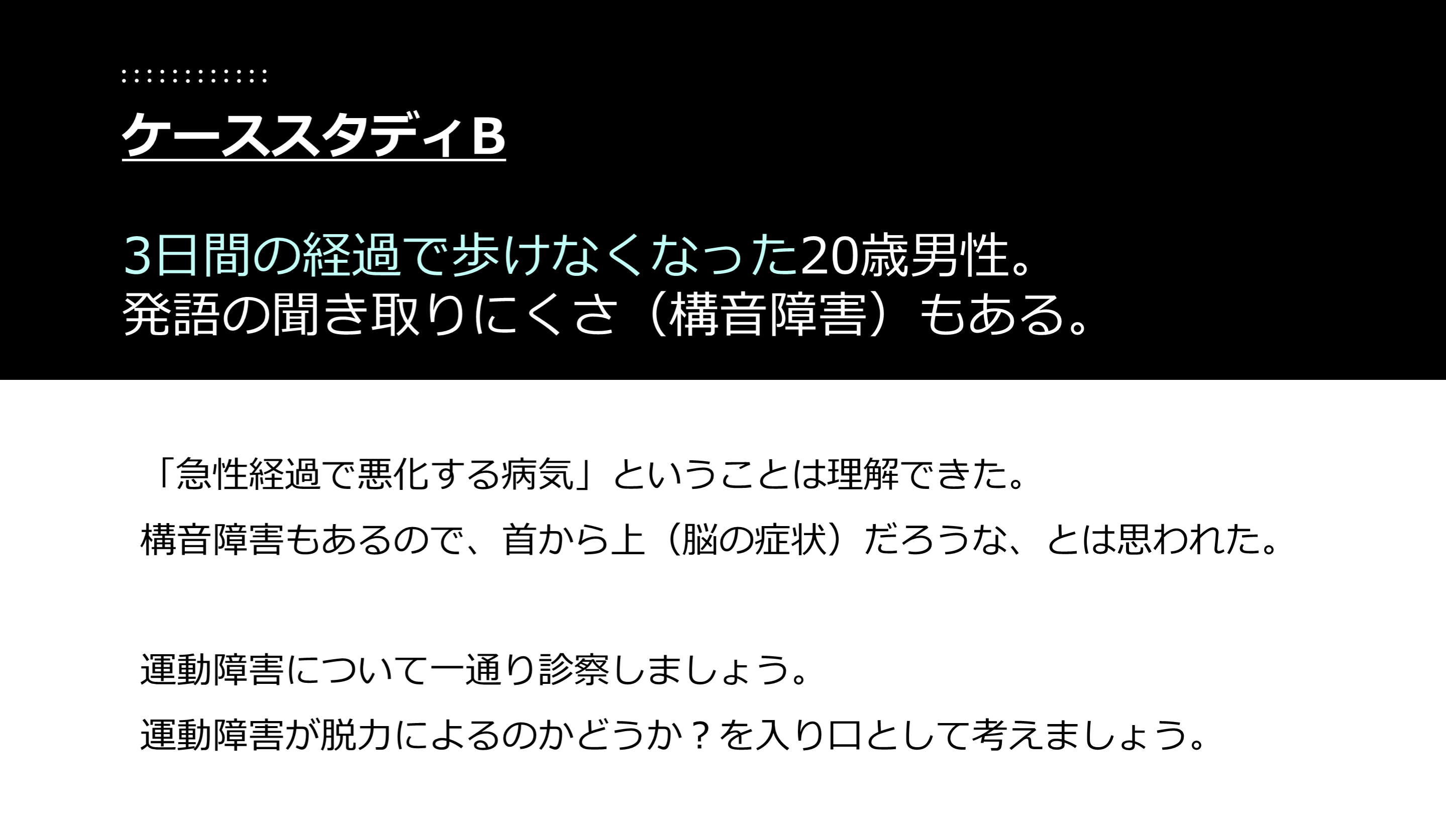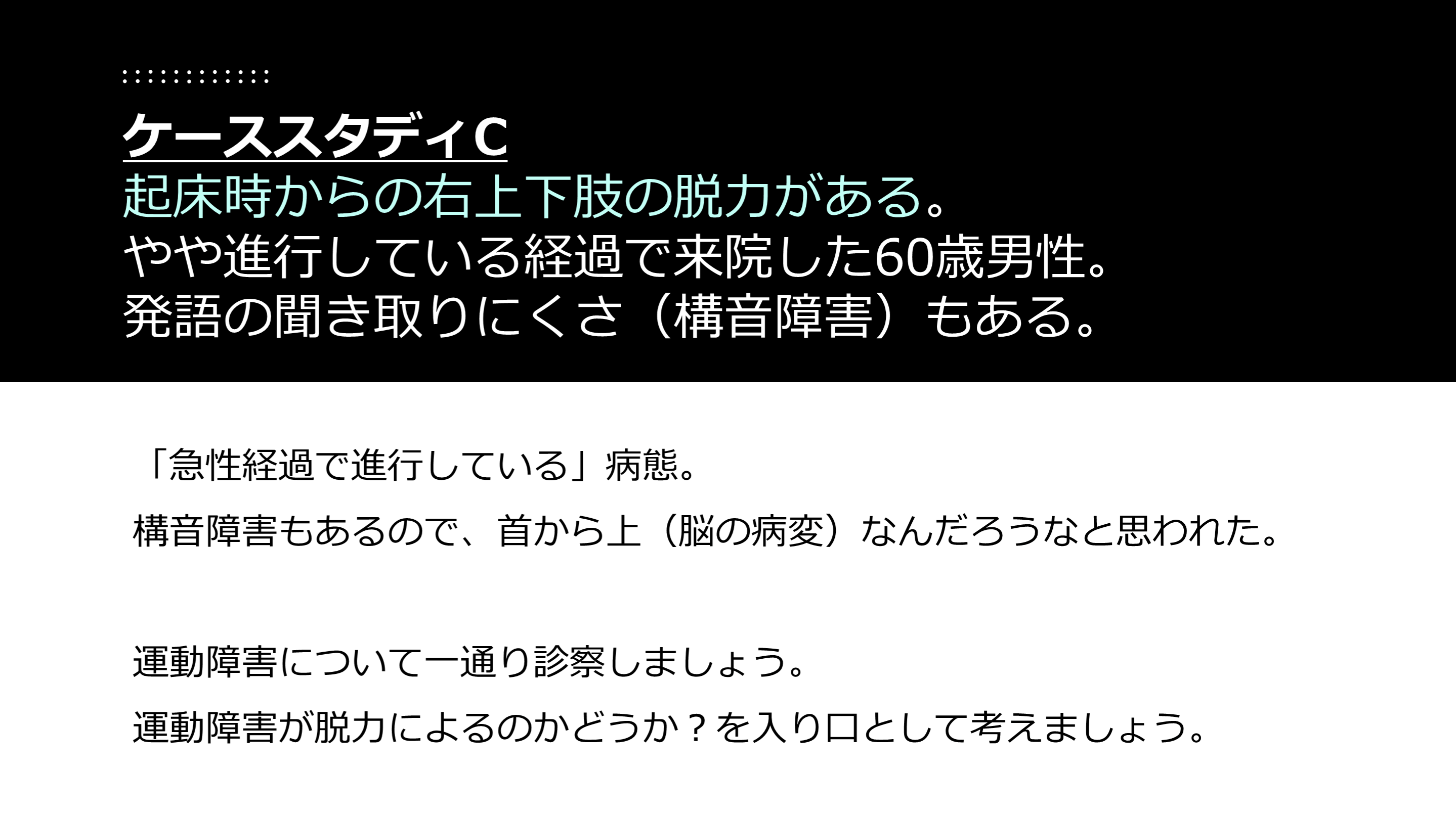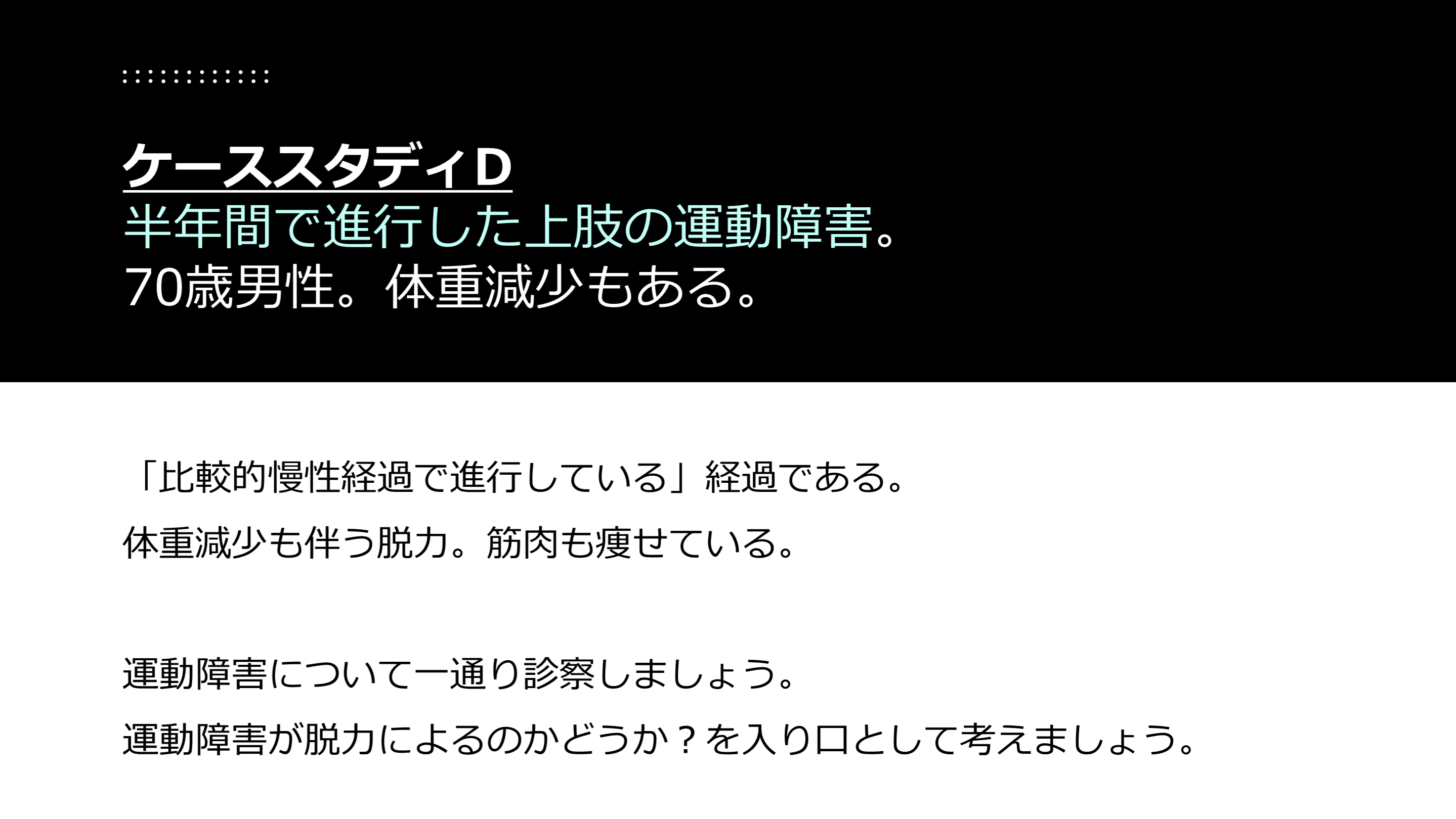 運動障害が脱力によるのかどうか?を入り口として考えましょう。 ケーススタディD