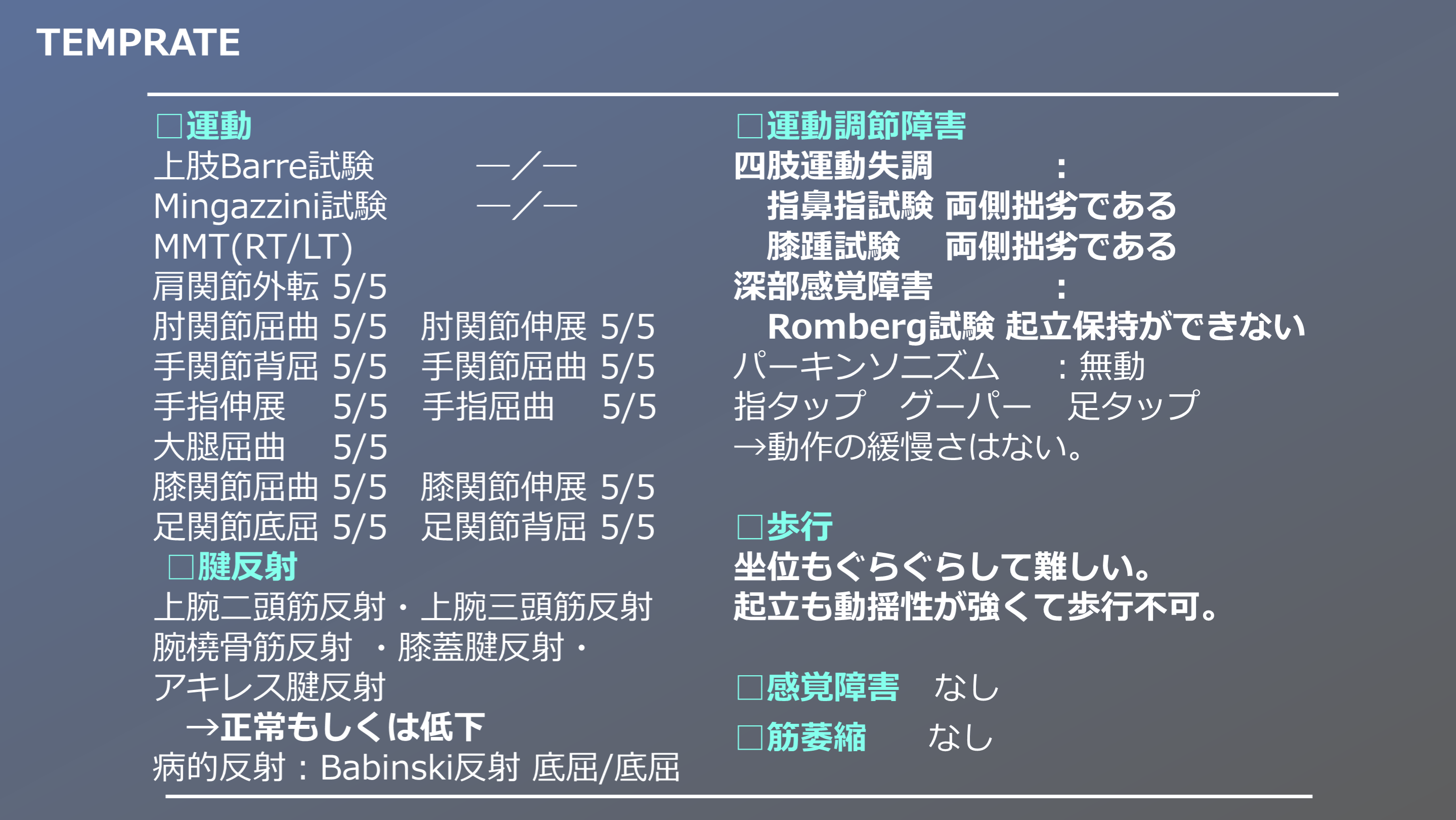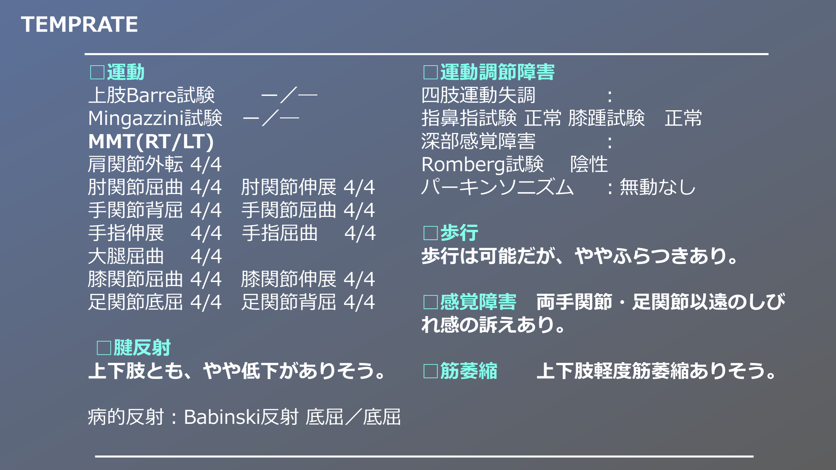 □筋萎縮 あり。手足の全体的な萎縮がある。手内筋のやせはある。大腿も普通よりはやせていそう。 TEMPRATE