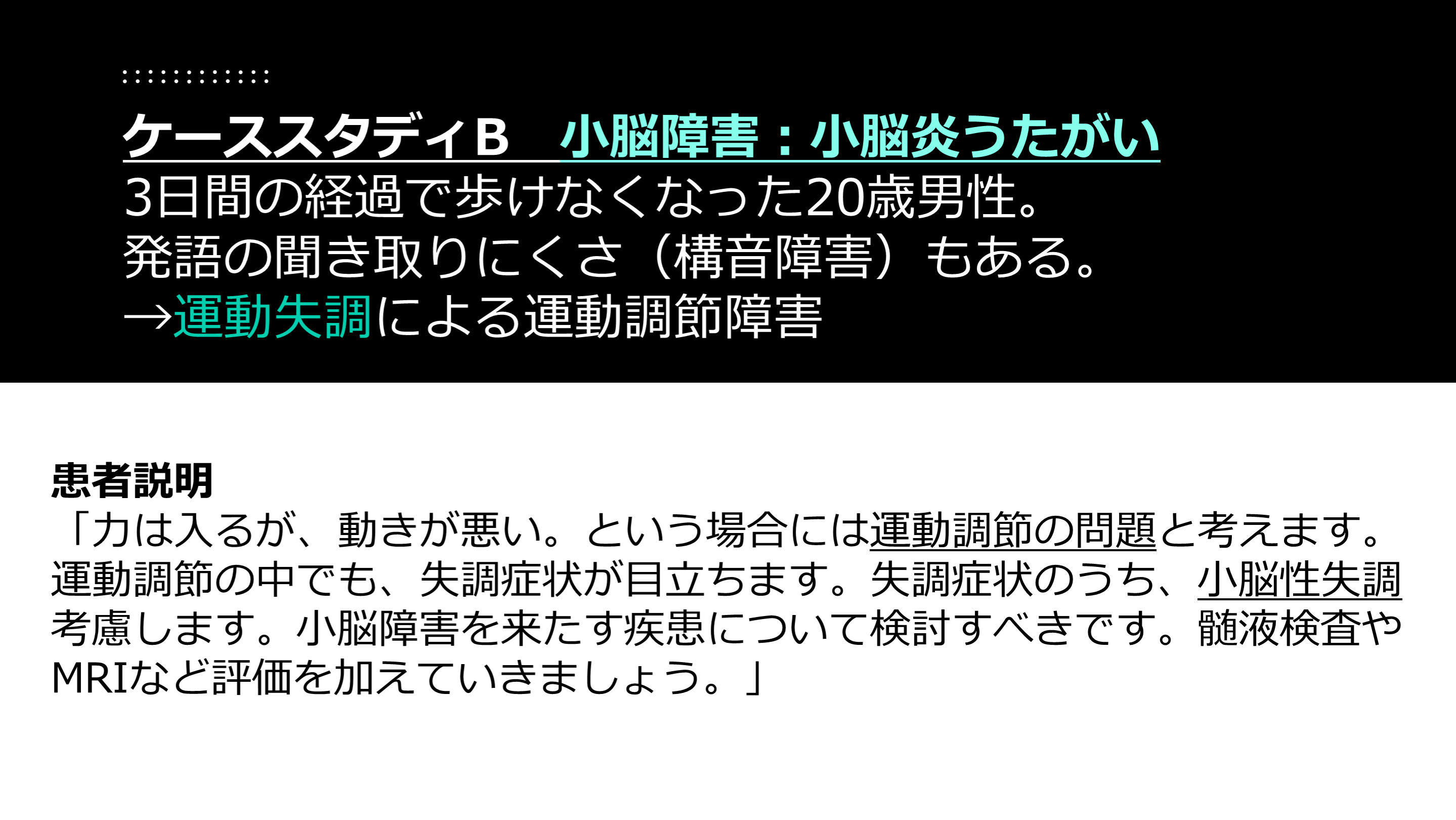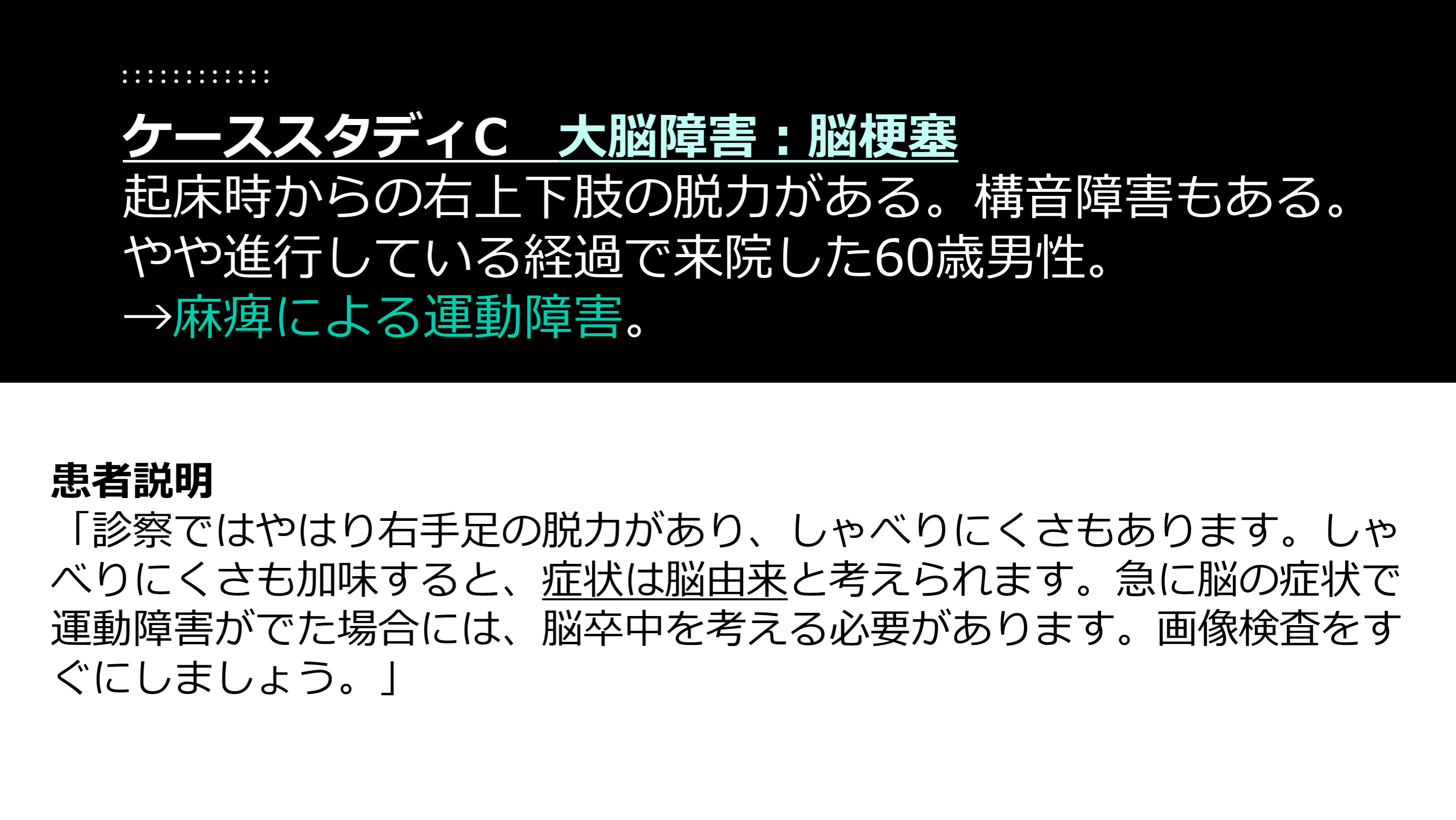 「診察ではやはり右手足の脱力があり、しゃべりにくさもあります。しゃべりにくさも加味すると、症状は脳由来と考えられます。急に脳の症状で運動障害がでた場合には、脳卒中を考える必要があります。画像検査をすぐにしましょう。」 ケーススタディC 大脳障害:脳梗塞