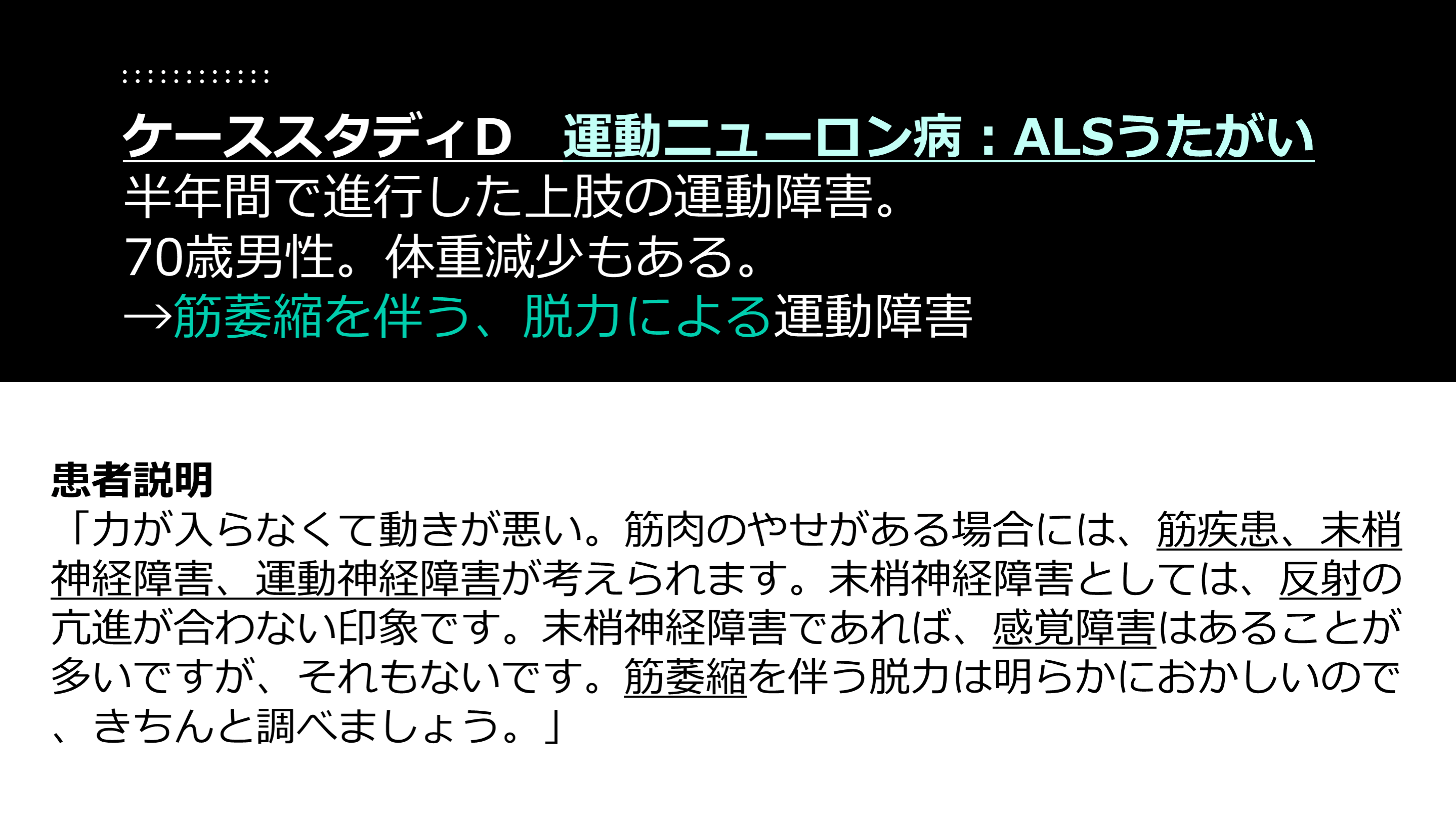 「力が入らなくて動きが悪い。筋肉のやせがある場合には、筋疾患、末梢神経障害、運動神経障害が考えられます。末梢神経障害としては、反射の亢進が合わない印象です。末梢神経障害であれば、感覚障害はあることが多いですが、それもないです。筋萎縮を伴う脱力は明らかにおかしいので、きちんと調べましょう。」 ケーススタディD 運動ニューロン病:ALSうたがい