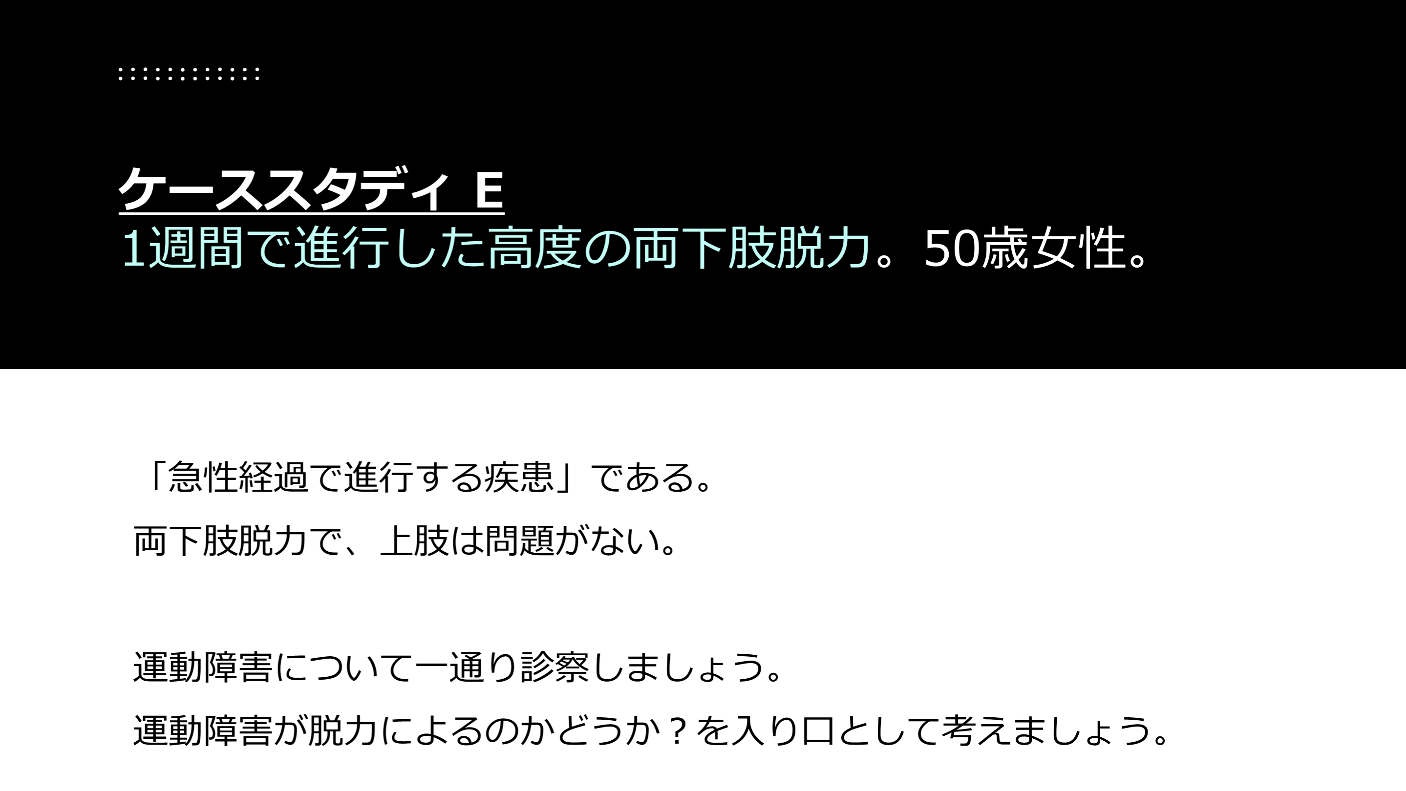 運動障害が脱力によるのかどうか?を入り口として考えましょう。 ケーススタディ E