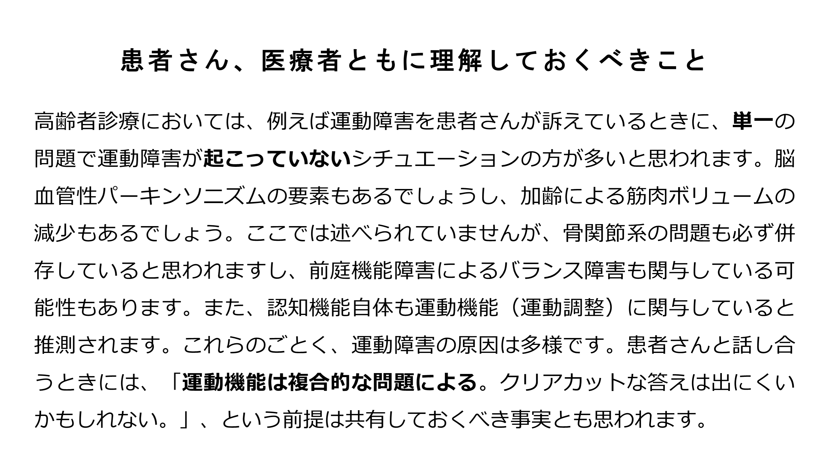 #52. 高齢者診療においては、例えば運動障害を患者さんが訴えているときに、単一の問題で運動障害が起こっていないシチュエーションの方が多いと思われます。脳血管性パーキンソニズムの要素もあるでしょうし、加齢による筋肉ボリュームの減少もあるでしょう。ここでは述べられていませんが、骨関節系の問題も必ず併存していると思われますし、前庭機能障害によるバランス障害も関与している可能性もあります。また、認知機能自体も運動機能(運動調整)に関与していると推測されます。これらのごとく、運動障害の原因は多様です。患者さんと話し合うときには、「運動機能は複合的な問題による。クリアカットな答えは出にくいかもしれない。」、という前提は共有しておくべき事実とも思われます。