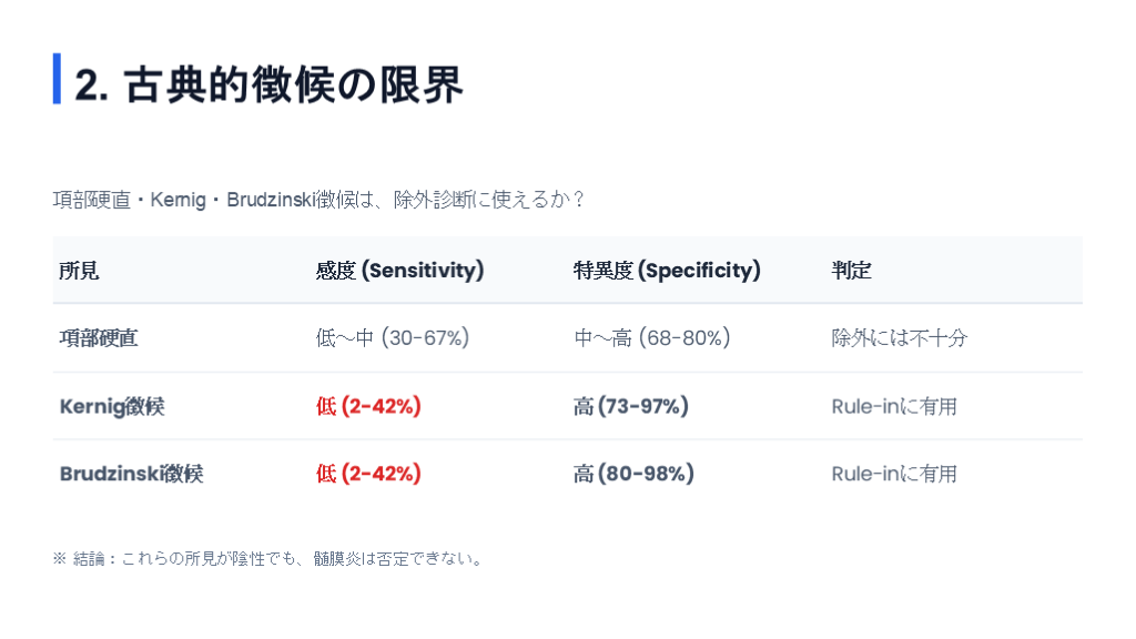 古典的徴候(項部硬直など)は「除外」ではなく「診断(Rule-in)」に使うものであると理解できる