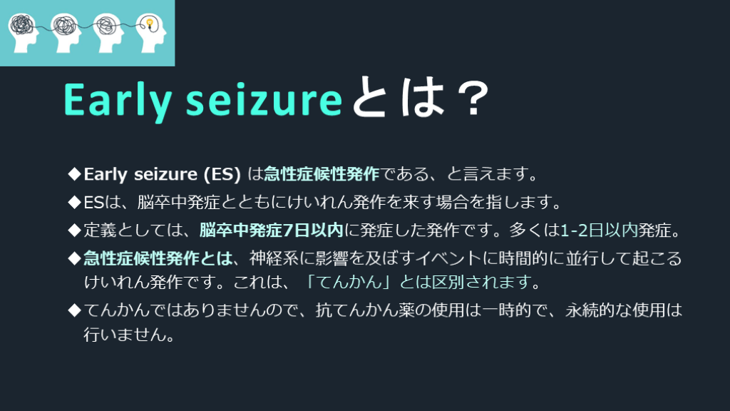 ESは、脳卒中発症とともにけいれん発作を来す場合を指します。