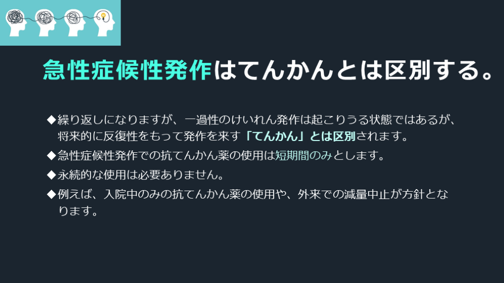 #5. 繰り返しになりますが、一過性のけいれん発作は起こりうる状態ではあるが、将来的に反復性をもって発作を来す「てんかん」とは区別されます。