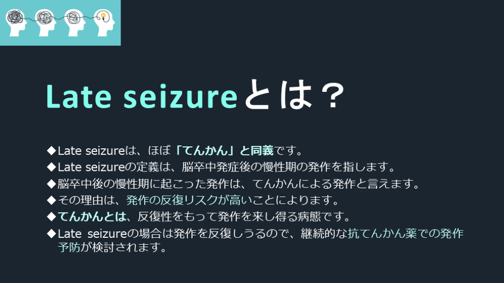 #7. Late seizureとは? Late seizureは、ほぼ「てんかん」と同義です。