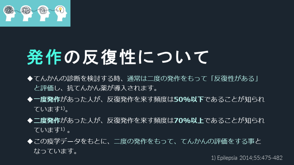 すなわち、抗てんかん薬導入が初回発作から議論されることになります。 1) Epilepsia 2014; 55: 475-482.