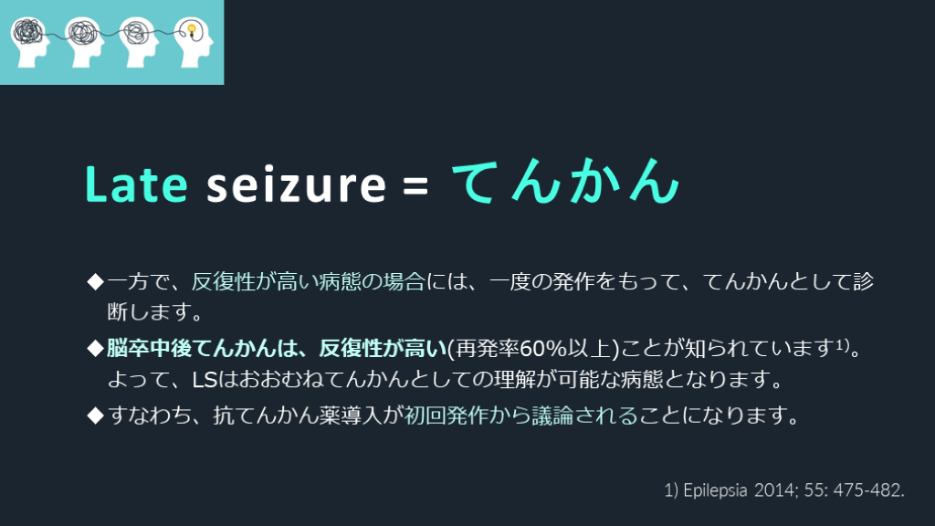 脳卒中後てんかんは、反復性が高い(再発率60%以上)ことが知られています1)。よって、LSはおおむねてんかんとしての理解が可能な病態となります。