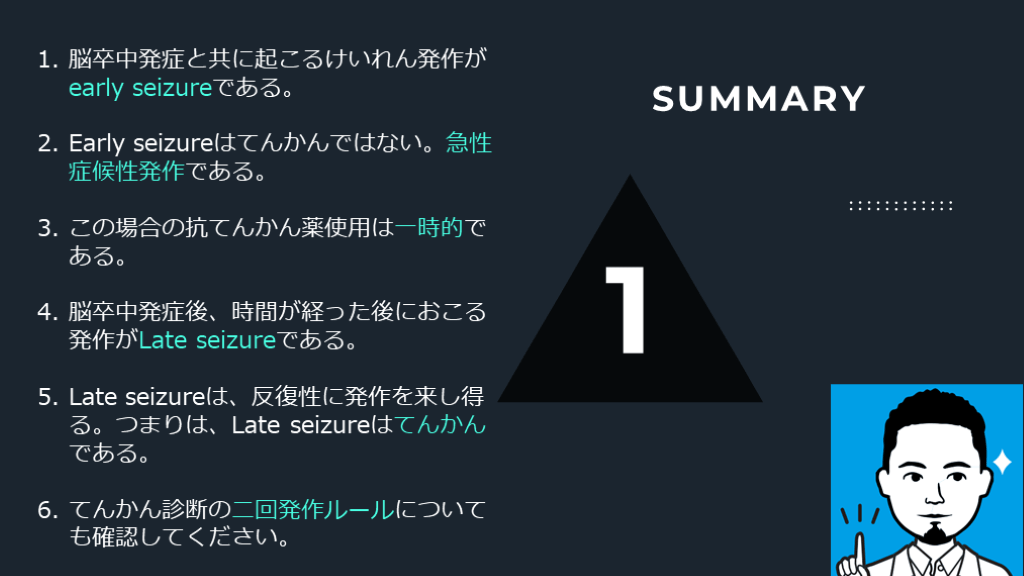 #10. SUMMARY 1 脳卒中発症と共に起こるけいれん発作がearly seizureである。