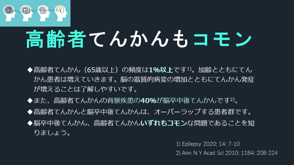 脳卒中後てんかん、高齢者てんかんいずれもコモンな問題であることを知りましょう。 高齢者てんかんもコモン 2) Ann N Y Acad Sci 2010; 1184: 208-224 1) Epilepsy 2020; 14: 7-10