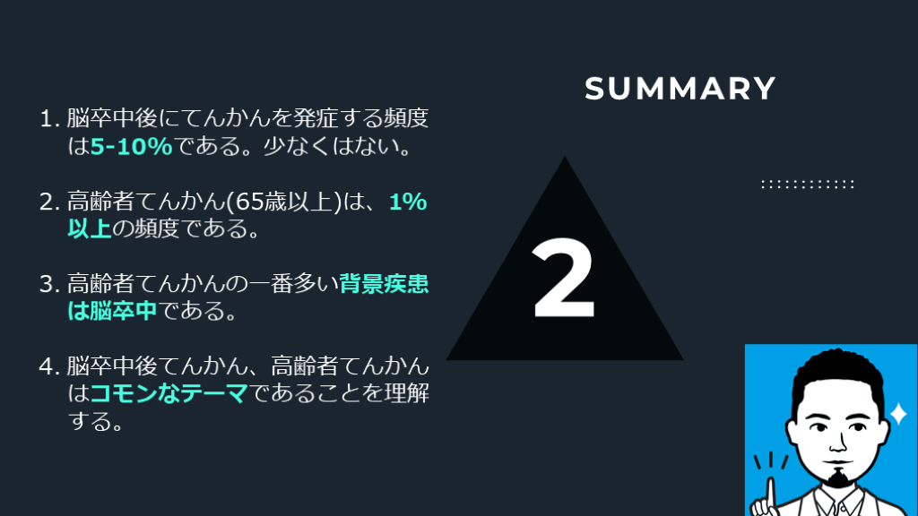 #15. SUMMARY 2 脳卒中後にてんかんを発症する頻度は5-10%である。少なくはない。