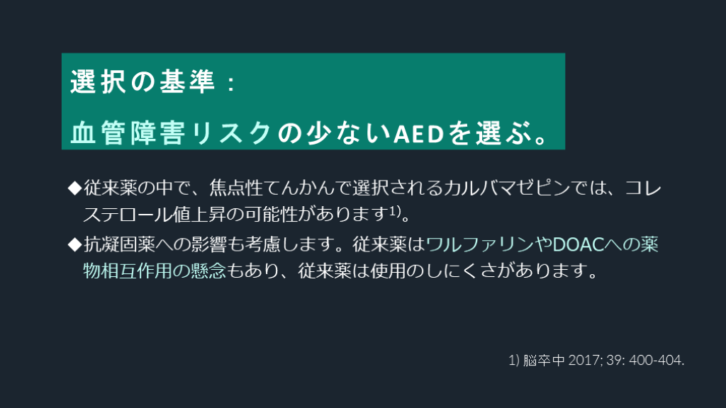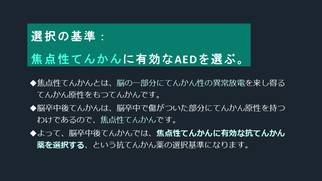 よって、脳卒中後てんかんでは、焦点性てんかんに有効な抗てんかん薬を選択する、という抗てんかん薬の選択基準になります。 選択の基準: