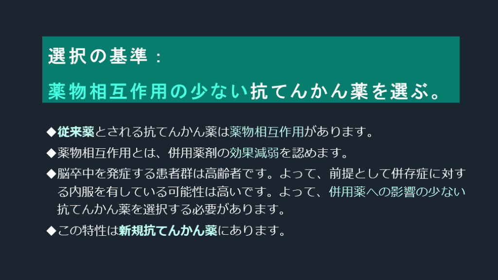 脳卒中を発症する患者群は高齢者です。よって、前提として併存症に対する内服を有している可能性は高いです。よって、併用薬への影響の少ない抗てんかん薬を選択する必要があります。