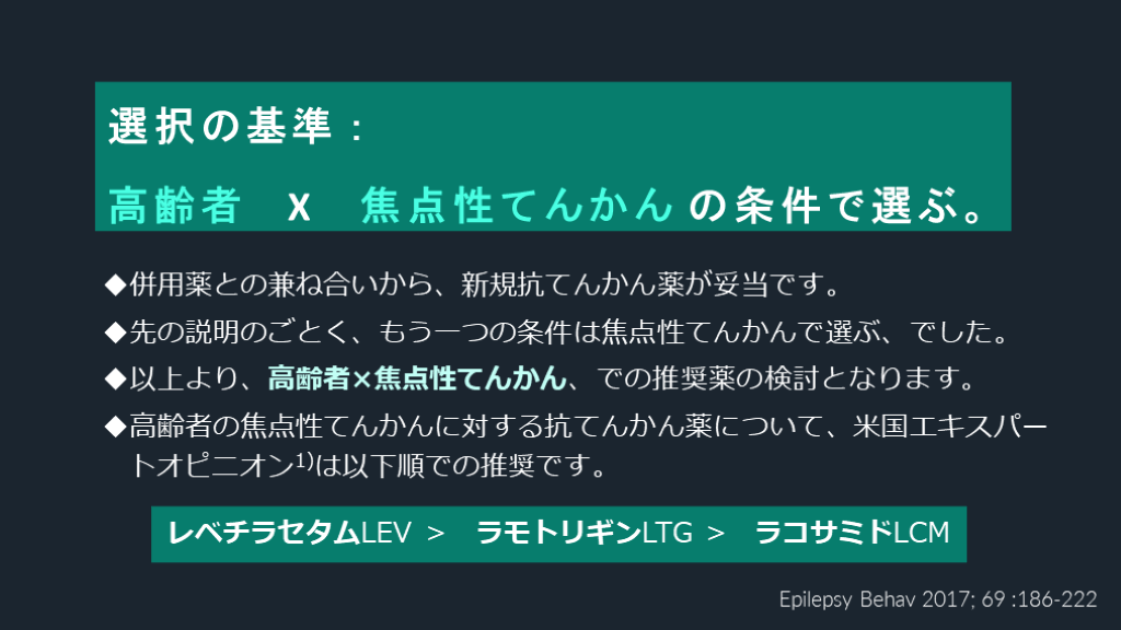以上より、高齢者×焦点性てんかん、での推奨薬の検討となります。