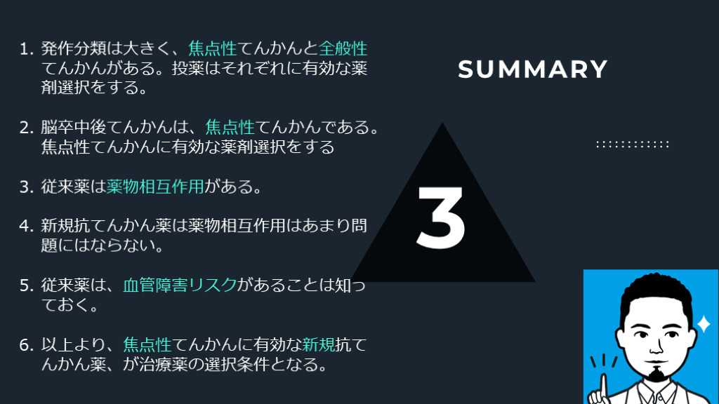 以上より、焦点性てんかんに有効な新規抗てんかん薬、が治療薬の選択条件となる。