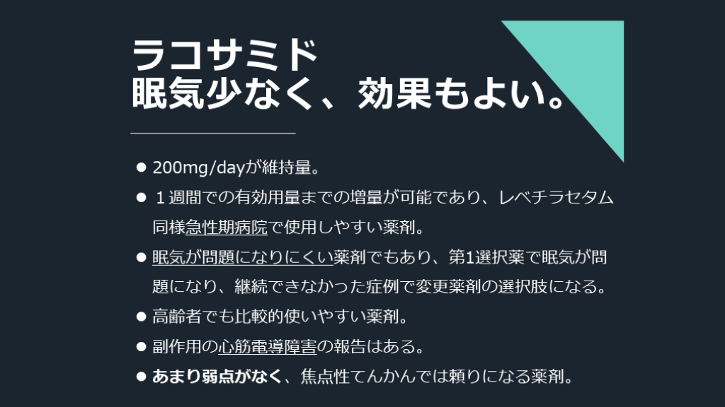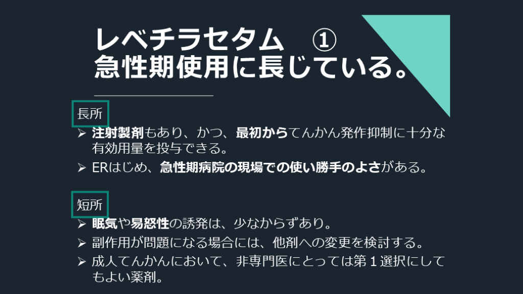 レベチラセタムはすぐに効果が発揮できる、副作用の少ない薬剤で、使い勝手がよい(点滴投与可な)薬剤である。