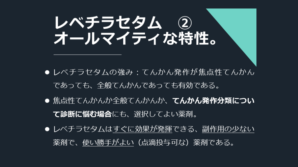 オールマイティな特性。 レベチラセタムの強み:てんかん発作が焦点性てんかん であっても、全般てんかんであっても有効である。