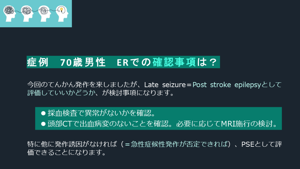 #33. 症例 70歳男性 ERでの確認事項は? 今回のてんかん発作を来しましたが、Late seizure=Post stroke epilepsyとして評価していいかどうか、が検討事項になります。