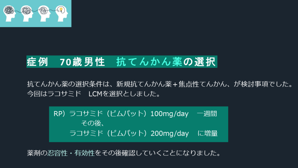 #36. 症例 70歳男性 抗てんかん薬の選択 抗てんかん薬の選択条件は、新規抗てんかん薬+焦点性てんかん、が検討事項でした。