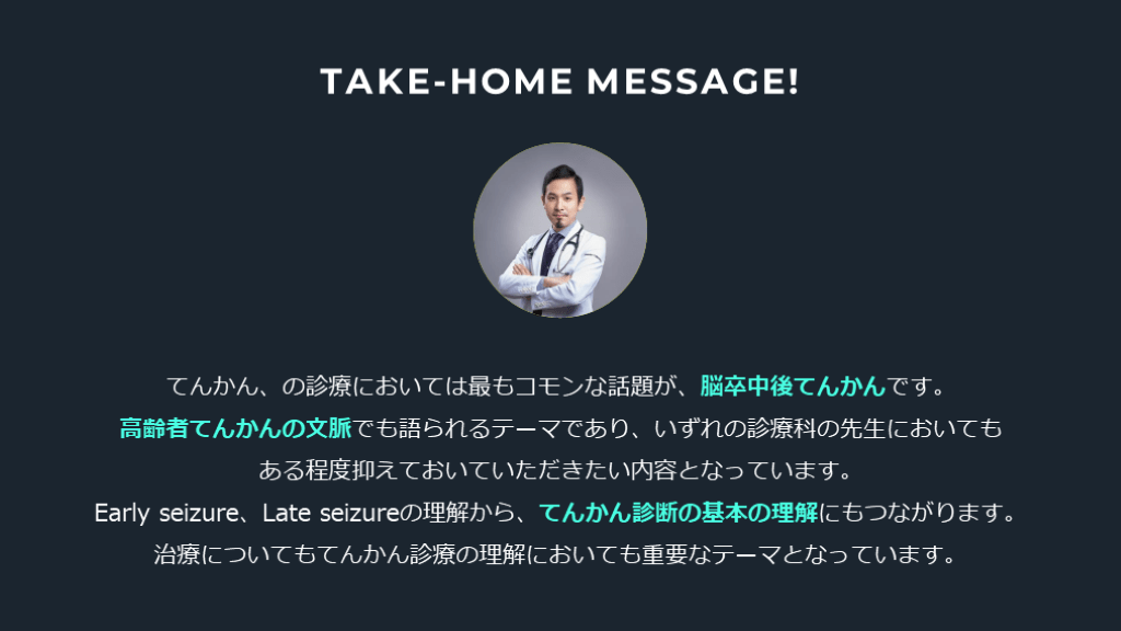 Early seizure、Late seizureの理解から、てんかん診断の基本の理解にもつながります。治療についてもてんかん診療の理解においても重要なテーマとなっています。 TAKE-HOME MESSAGE!