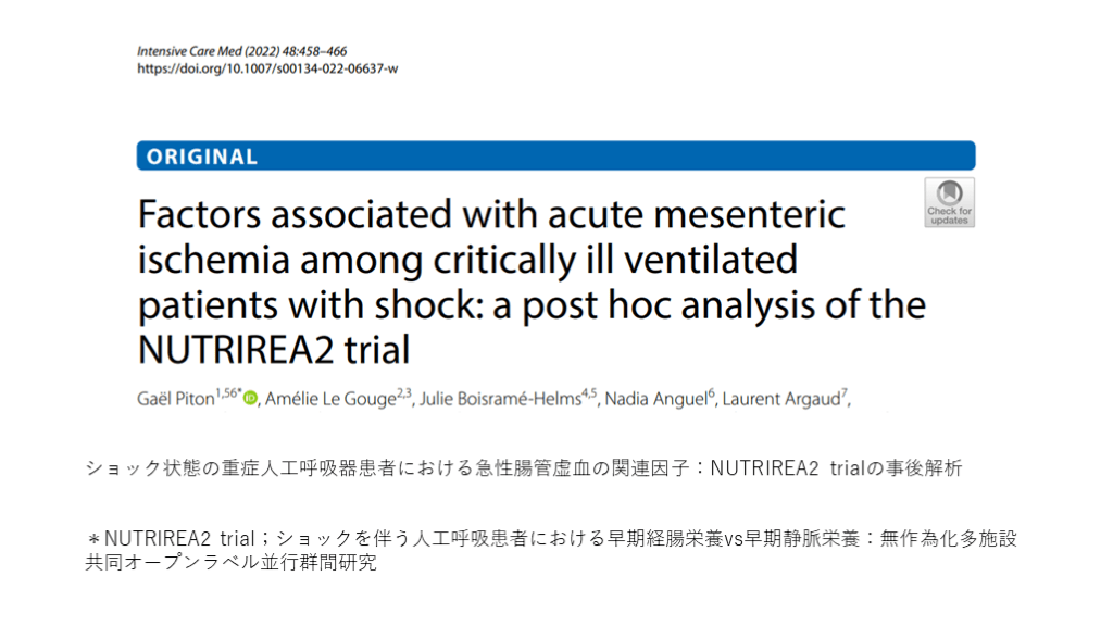 #2. ショック状態の重症人工呼吸器患者における急性腸管虚血の関連因子:NUTRIREA2 trialの事後解析
