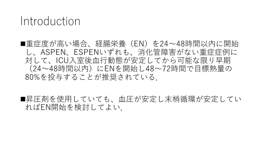#3. Introduction 重症度が高い場合、経腸栄養(EN)を24~48時間以内に開始し、ASPEN、ESPENいずれも、消化管障害がない重症症例に対して、ICU入室後血行動態が安定してから可能な限り早期(24~48時間以内)にENを開始し48~72時間で目標熱量の80%を投与することが推奨されている.