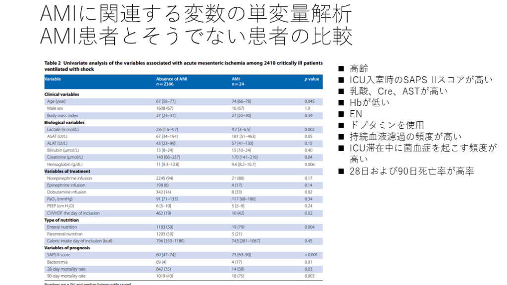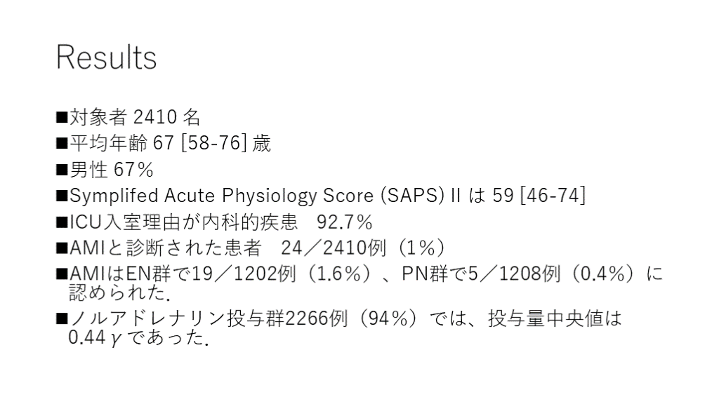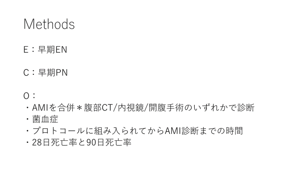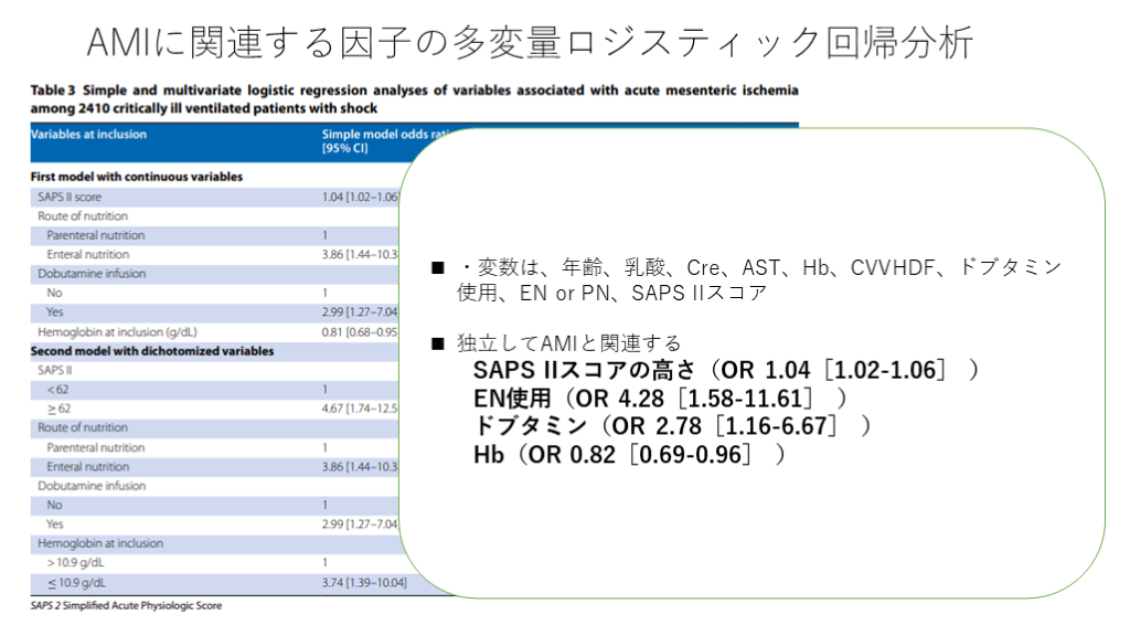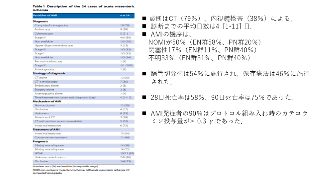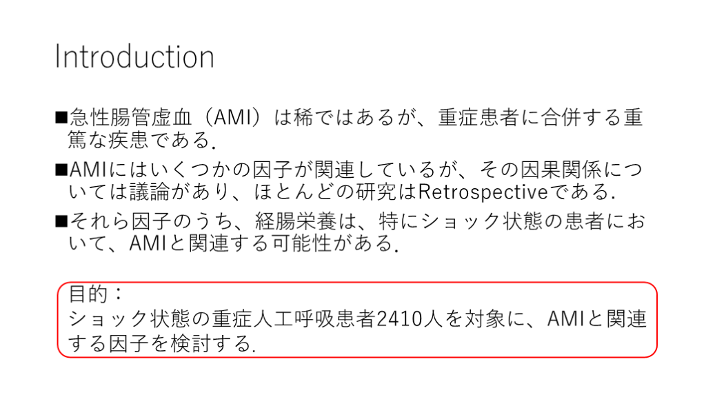それら因子のうち、経腸栄養は、特にショック状態の患者において、AMIと関連する可能性がある. 目的: