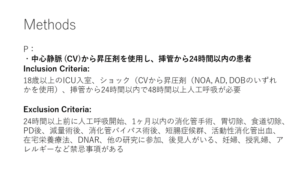 24時間以上前に人工呼吸開始、1ヶ月以内の消化管手術、胃切除、食道切除、PD後、減量術後、消化管バイパス術後、短腸症候群、活動性消化管出血、在宅栄養療法、DNAR、他の研究に参加、後見人がいる、妊婦、授乳婦、アレルギーなど禁忌事項がある