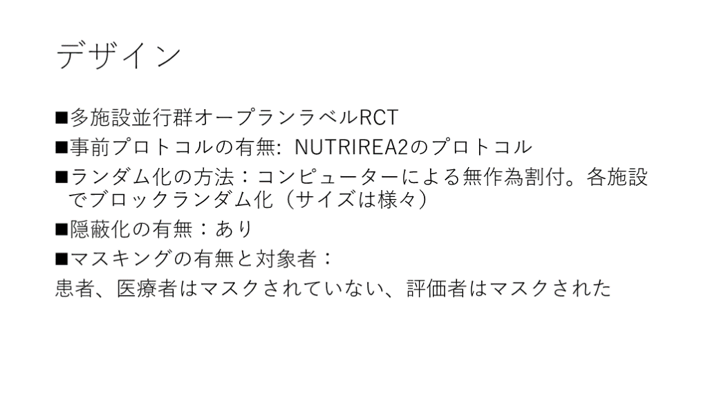 ランダム化の方法:コンピューターによる無作為割付。各施設でブロックランダム化(サイズは様々)
