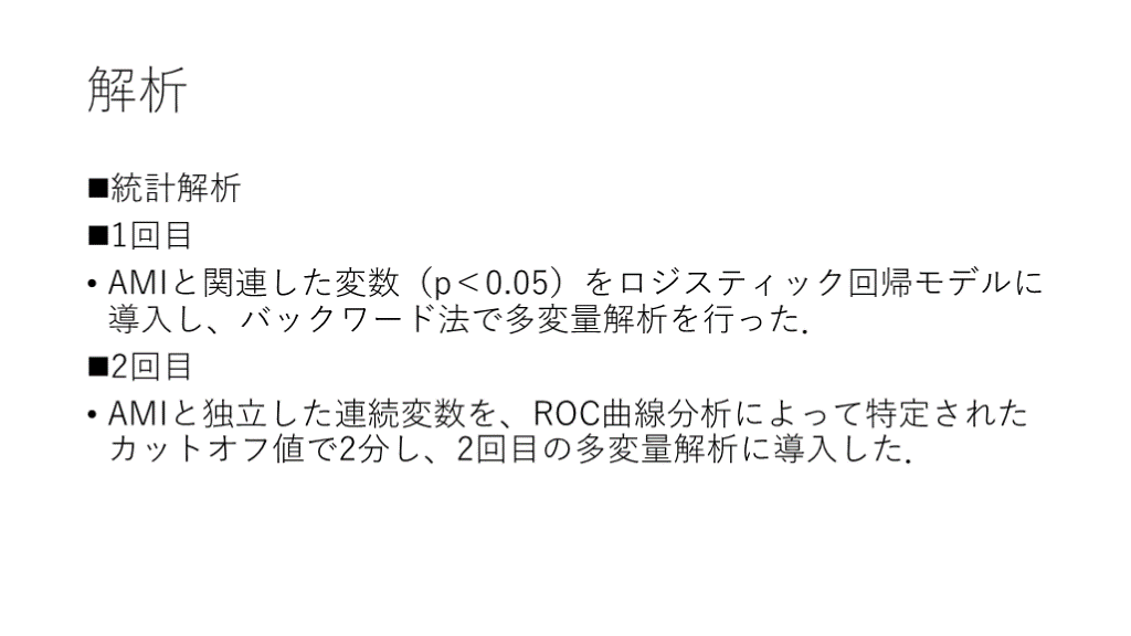 AMIと独立した連続変数を、ROC曲線分析によって特定されたカットオフ値で2分し、2回目の多変量解析に導入した.