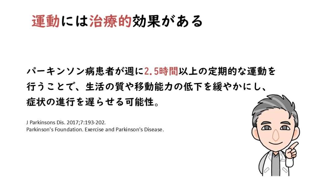 #2. 運動には治療的効果がある パーキンソン病患者が週に2.5時間以上の定期的な運動を行うことで、生活の質や移動能力の低下を緩やかにし、症状の進行を遅らせる可能性。 J Parkinsons Dis. 2017;7:193-202.