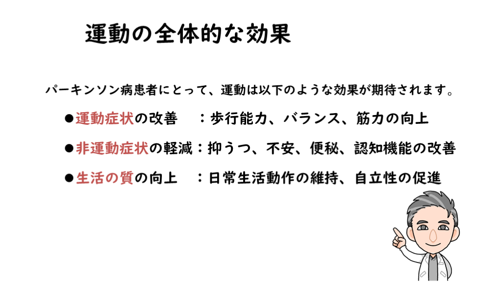 #3. 運動の全体的な効果 パーキンソン病患者にとって、運動は以下のような効果が期待されます。