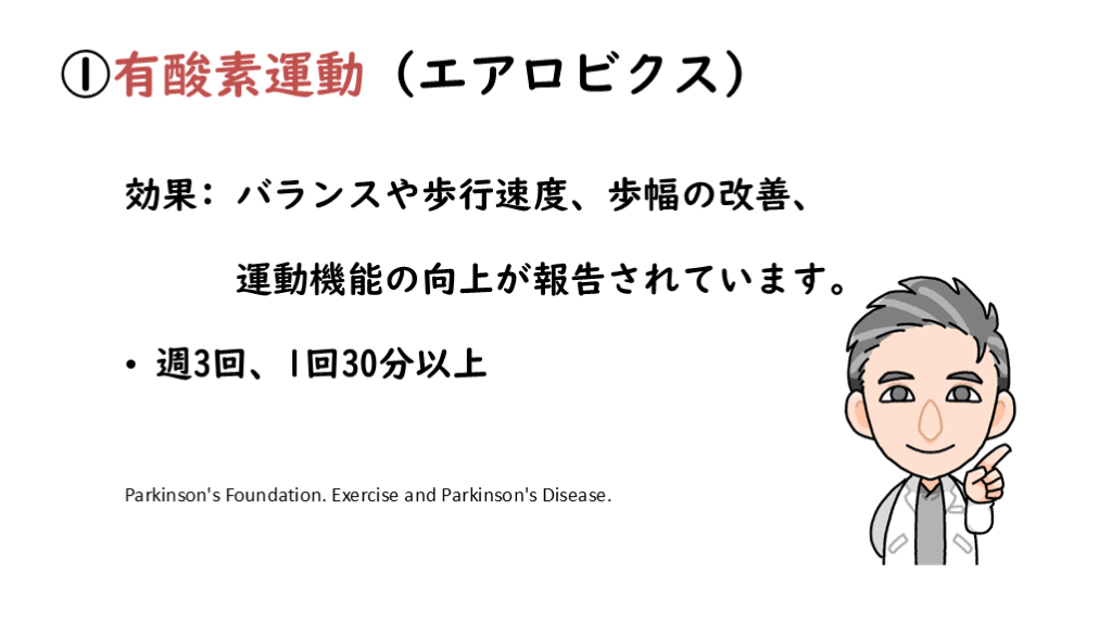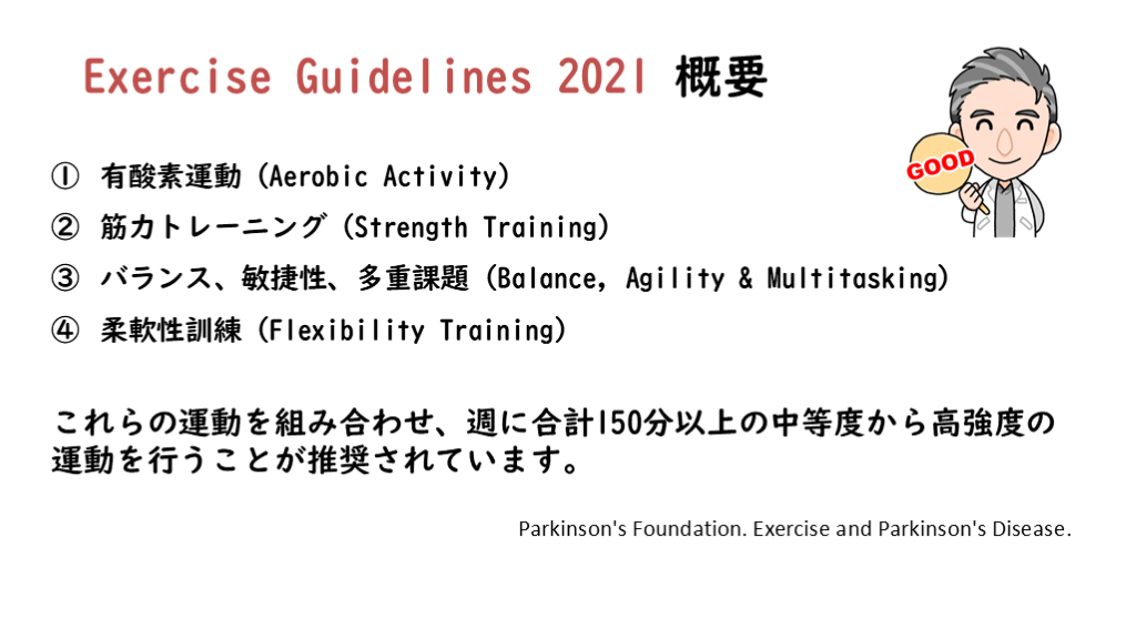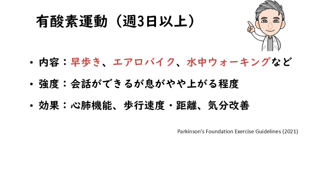 効果:心肺機能、歩行速度・距離、気分改善 Parkinson’s Foundation Exercise Guidelines (2021)