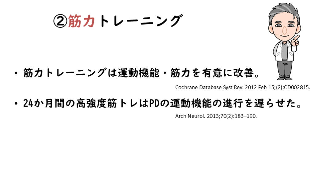 24か月間の高強度筋トレはPDの運動機能の進行を遅らせた。 Cochrane Database Syst Rev. 2012 Feb 15;(2):CD002815. Arch Neurol. 2013;70(2):183–190.