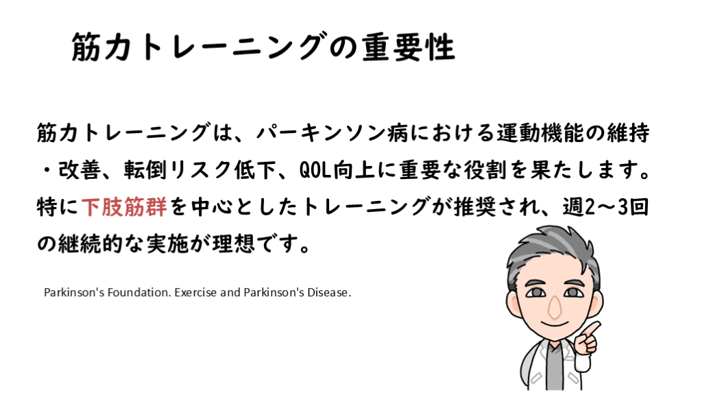 #10. 筋力トレーニングの重要性 筋力トレーニングは、パーキンソン病における運動機能の維持・改善、転倒リスク低下、QOL向上に重要な役割を果たします。特に下肢筋群を中心としたトレーニングが推奨され、週2〜3回の継続的な実施が理想です。 Parkinson's Foundation. Exercise and Parkinson's Disease.