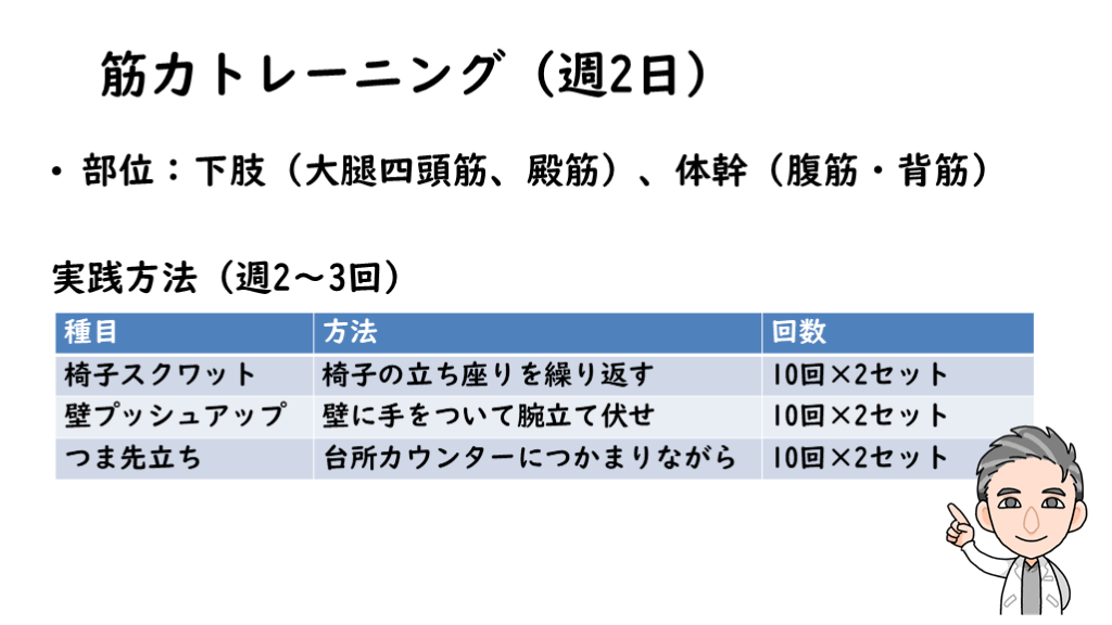 #11. 筋力トレーニング(週2日) 部位:下肢(大腿四頭筋、殿筋)、体幹(腹筋・背筋)