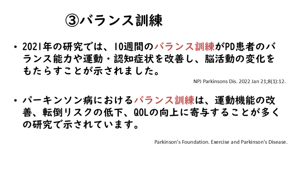 #12. ③バランス訓練 2021年の研究では、10週間のバランス訓練がPD患者のバランス能力や運動・認知症状を改善し、脳活動の変化をもたらすことが示されました。