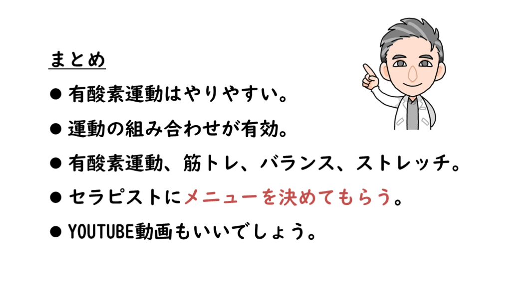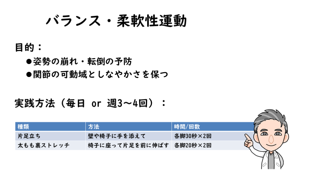 有酸素運動、筋トレ、バランス、ストレッチ。