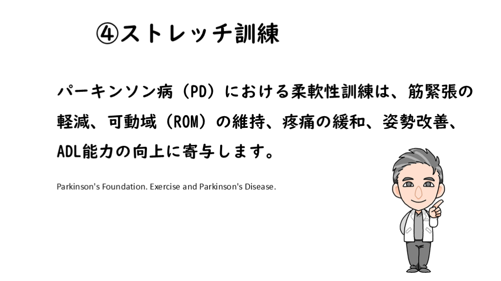 #15. ④ストレッチ訓練 パーキンソン病(PD)における柔軟性訓練は、筋緊張の軽減、可動域(ROM)の維持、疼痛の緩和、姿勢改善、ADL能力の向上に寄与します。 Parkinson's Foundation. Exercise and Parkinson's Disease.