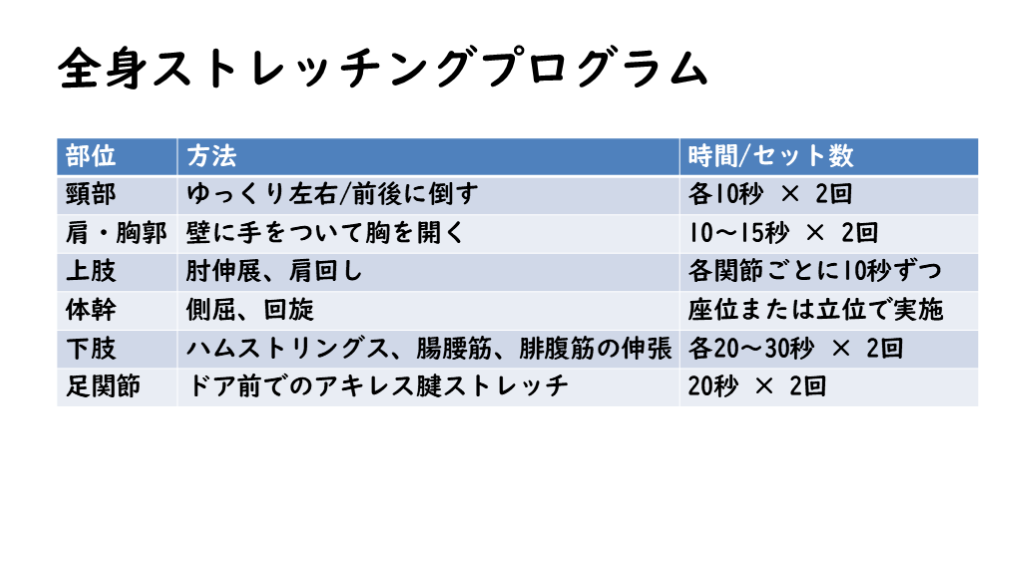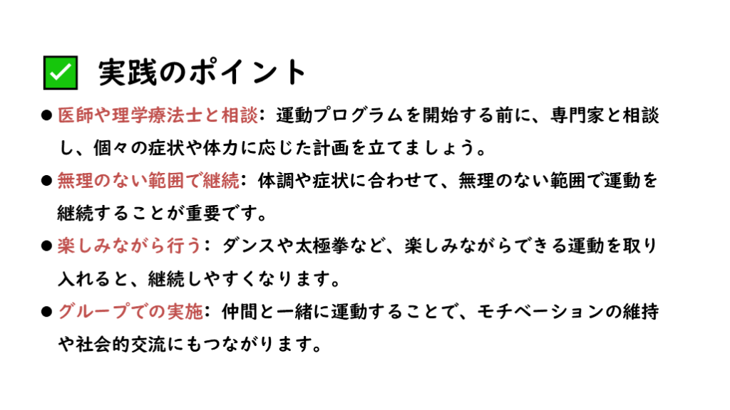 グループでの実施: 仲間と一緒に運動することで、モチベーションの維持や社会的交流にもつながります。