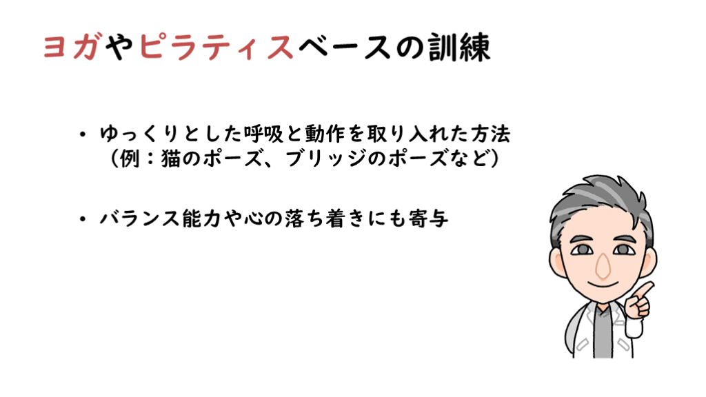 #17. ヨガやピラティスベースの訓練 ゆっくりとした呼吸と動作を取り入れた方法(例:猫のポーズ、ブリッジのポーズなど)