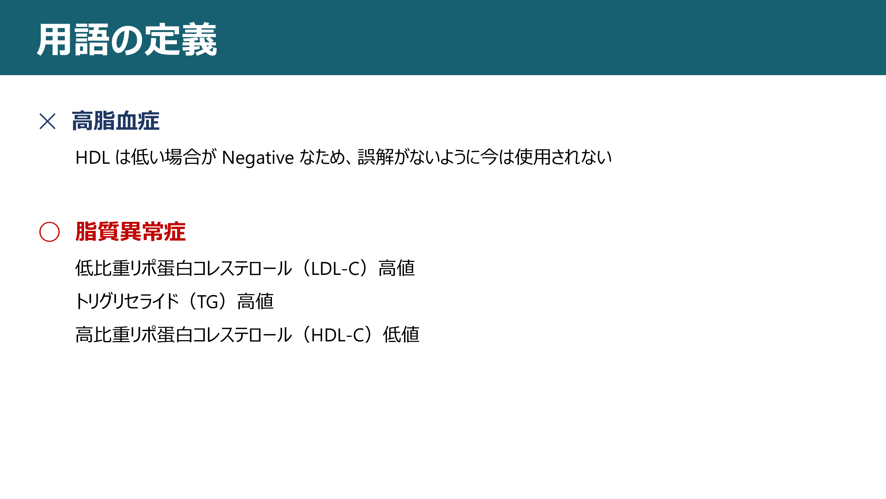 #2. ⽤語の定義 ✕ ⾼脂⾎症 HDL は低い場合が Negative なため、誤解がないように今は使⽤されない ◯ 脂質異常症 低⽐重リポ蛋⽩コレステロール(LDL-C)⾼値 トリグリセライド(TG)⾼値 ⾼⽐重リポ蛋⽩コレステロール(HDL-C)低値