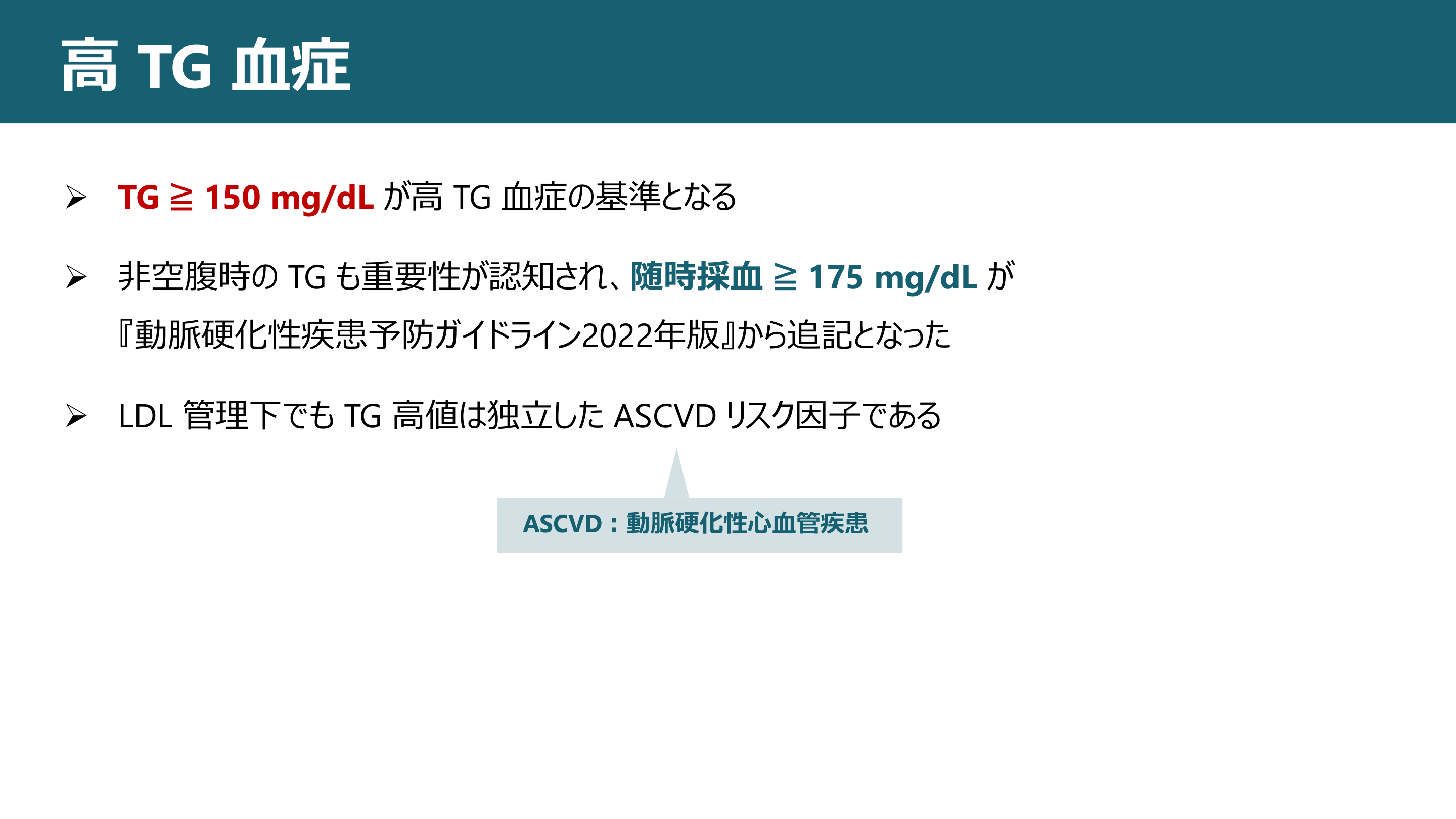 #3. ⾼ TG ⾎症 Ø TG ≧ 150 mg/dL が⾼ TG ⾎症の基準となる Ø ⾮空腹時の TG も重要性が認知され、随時採⾎ ≧ 175 mg/dL が 『動脈硬化性疾患予防ガイドライン2022年版』から追記となった Ø LDL 管理下でも TG ⾼値は独⽴した ASCVD リスク因⼦である ASCVD︓動脈硬化性⼼⾎管疾患