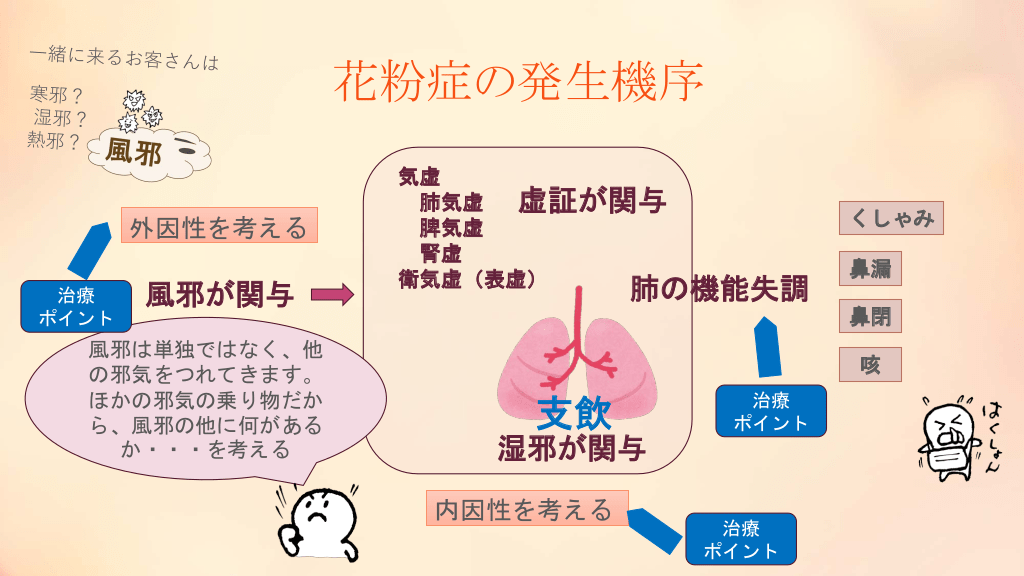 #11. 花粉症の発生機序 外因性を考える 治療 ポイント 風邪が関与 風邪は単独ではなく、他 の邪気をつれてきます。 ほかの邪気の乗り物だか ら、風邪の他に何がある か・・・を考える 気虚 肺気虚 虚証が関与 脾気虚 腎虚 衛気虚(表虚) くしゃみ 肺の機能失調 鼻漏 鼻閉 咳 支飲 治療 ポイント 湿邪が関与 内因性を考える 治療 ポイント