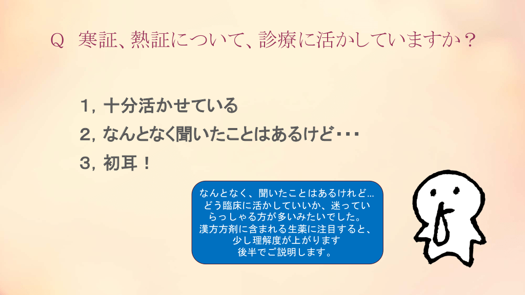 #12. Q 寒証、熱証について、診療に活かしていますか? 1,十分活かせている 2,なんとなく聞いたことはあるけど・・・ 3,初耳! なんとなく、聞いたことはあるけれど… どう臨床に活かしていいか、迷ってい らっしゃる方が多いみたいでした。 漢方方剤に含まれる生薬に注目すると、 少し理解度が上がります 後半でご説明します。