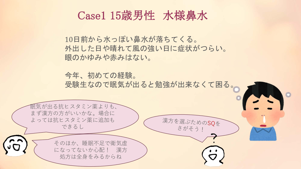 #16. Case1 15歳男性 水様鼻水 10日前から水っぽい鼻水が落ちてくる。 外出した日や晴れて風の強い日に症状がつらい。 眼のかゆみや赤みはない。 今年、初めての経験。 受験生なので眠気が出ると勉強が出来なくて困る。 眠気が出る抗ヒスタミン薬よりも、 まず漢方の方がいいかな。場合に よっては抗ヒスタミン薬に追加も できるし そのほか、睡眠不足で衛気虚 になってないか心配! 漢方 処方は全身をみるからね