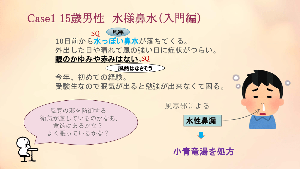 #17. Case1 15歳男性 水様鼻水(入門編) 風寒 SQ 10日前から水っぽい鼻水が落ちてくる。 外出した日や晴れて風の強い日に症状がつらい。 SQ 眼のかゆみや赤みはない。 風熱はなさそう 今年、初めての経験。 受験生なので眠気が出ると勉強が出来なくて困る。 風寒の邪を防御する 衛気が虚しているのかなあ、 食欲はあるかな? よく眠っているかな? 風寒邪による 水性鼻漏 小青竜湯を処方