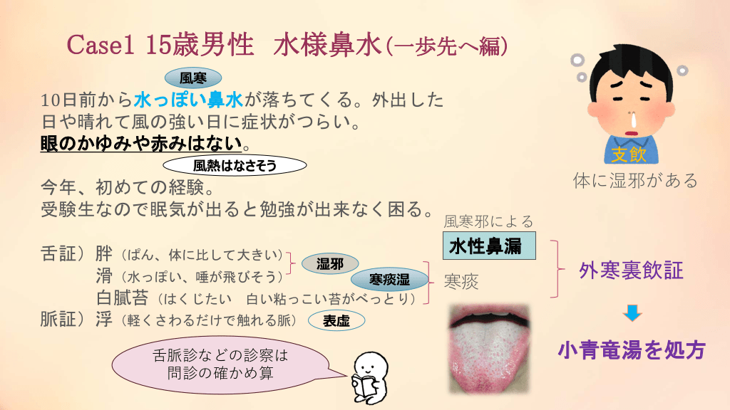 #18. Case1 15歳男性 水様鼻水(一歩先へ編) 風寒 10日前から水っぽい鼻水が落ちてくる。外出した 日や晴れて風の強い日に症状がつらい。 眼のかゆみや赤みはない。 支飲 体に湿邪がある 風熱はなさそう 今年、初めての経験。 受験生なので眠気が出ると勉強が出来なく困る。 舌証)胖(ぱん、体に比して大きい) 湿邪 滑(水っぽい、唾が飛びそう) 寒痰湿 白膩苔(はくじたい 白い粘っこい苔がべっとり) 脈証)浮(軽くさわるだけで触れる脈) 表虚 舌脈診などの診察は 問診の確かめ算 風寒邪による 水性鼻漏 寒痰 外寒裏飲証 小青竜湯を処方