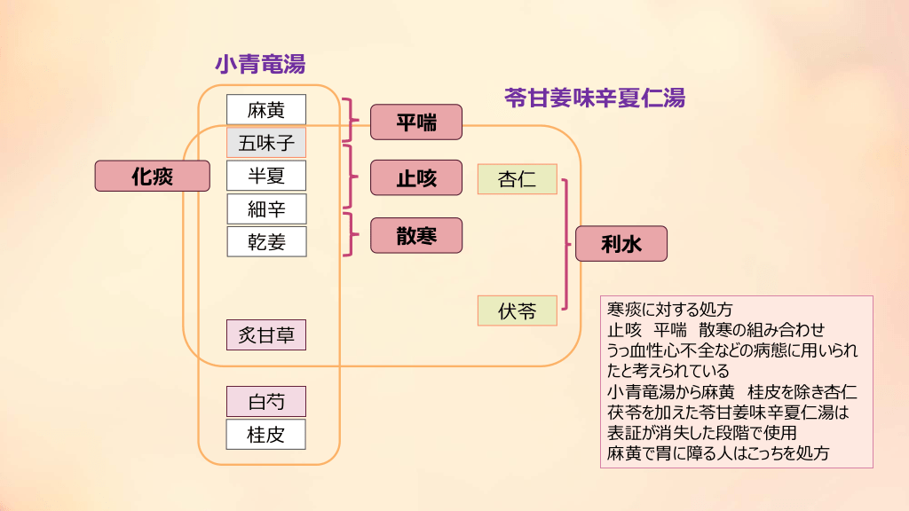 #19. 小青竜湯 麻黄 五味子 化痰 半夏 細辛 乾姜 炙甘草 白芍 桂皮 平喘 止咳 苓甘姜味辛夏仁湯 杏仁 散寒 利水 伏苓 寒痰に対する処方 止咳 平喘 散寒の組み合わせ うっ血性心不全などの病態に用いられ たと考えられている 小青竜湯から麻黄 桂皮を除き杏仁 茯苓を加えた苓甘姜味辛夏仁湯は 表証が消失した段階で使用 麻黄で胃に障る人はこっちを処方