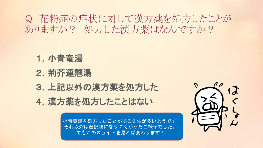 #2. Q 花粉症の症状に対して漢方薬を処方したことが ありますか? 処方した漢方薬はなんですか? 1,小青竜湯 2,荊芥連翹湯 3,上記以外の漢方薬を処方した 4,漢方薬を処方したことはない 小青竜湯を処方したことがある先生が多いようです。 それ以外は選択肢になりにくかったご様子でした。 でもこのスライドを見れば変わります!